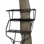 Padded, Flip-Back Shooting Rail / Wide Foot Platform / Flex-Tek seat contours to legs, ultra light and durable / HEIGHT: 18? Tall / FOOT PLATFORM: 36.5? Wide x 12.5? Deep / SEAT: 36.5? Wide x 12? Deep / CONSTRUCTION: Steel / LADDER SECTIONS: 3 x Single Rail / SEAT HEIGHT: 17? / FASTENERS: One 1? Ratchet Strap, Two 1? Stabilizer Straps / SUPPORT BAR: Adjustable / SAFETY HARNESS: Two 4-pt Full-Body Harnesses / MINIMUM TREE SIZE: 9? Diameter / STAND WEIGHT: 53 Lbs. / WEIGHT RATING: 500 Lbs.