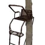 17′ tall to the Shooting Rail / Flex_Tek Seat and Backrest / Flip_up Padded Shooting Rail / Flip_back Footrest / Fasteners: One 1″ Ratchet Strap, Two 1″ Stabilizer Straps / Construction: Steel / Foot Platform: 18″ Wide x 10″ Deep / Seat: 17″ Wide x 14″ Deep / Seat Height: 21″ / Ladder Sections: 3 Single Rail Sections / Backrest: 17″ Wide x 14″ Tall / Support Bar: Adjustable / Safety Harness: One 4_pt. Full_body Harness / Minimum Tree Size: 9″ Diameter / Stand Weight: 43 lbs. / Weight Rating: 300 lbs.