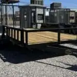| GVWR: 7,000# Top Rail: 2×2 angle 1’ open Coupler: 7k coupler Axle: 3,500# idler & 3,500# brake Safety Chain: 1/4″ Suspension: Multi leaf Jack: 2k top wind Tire/Wheel: 15” 205/75/R15 Tongue: 4″ Channel Frame: 3×2 angle 3/16 Crossmembers: 3×2 angle 3/16 Paint: 2-Stage Urethane 4’ Mesh Gate 7 Way round electrical hookup 4′ Slide in or stand up ramps Second brake axle |